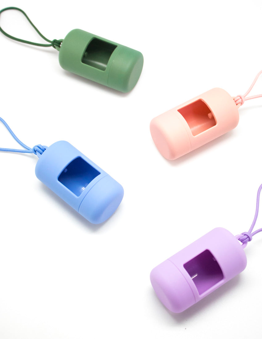 It comes complete with an elastic strap for easy attachment to any belt or bag, a rotating lid for easy refilling and a complementary roll of our eco-friendly excrement bags.