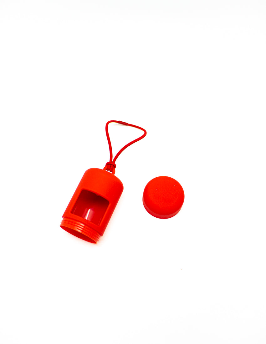 It comes complete with an elastic strap for easy attachment to any belt or bag, a rotating lid for easy refilling and a complementary roll of our eco-friendly excrement bags.