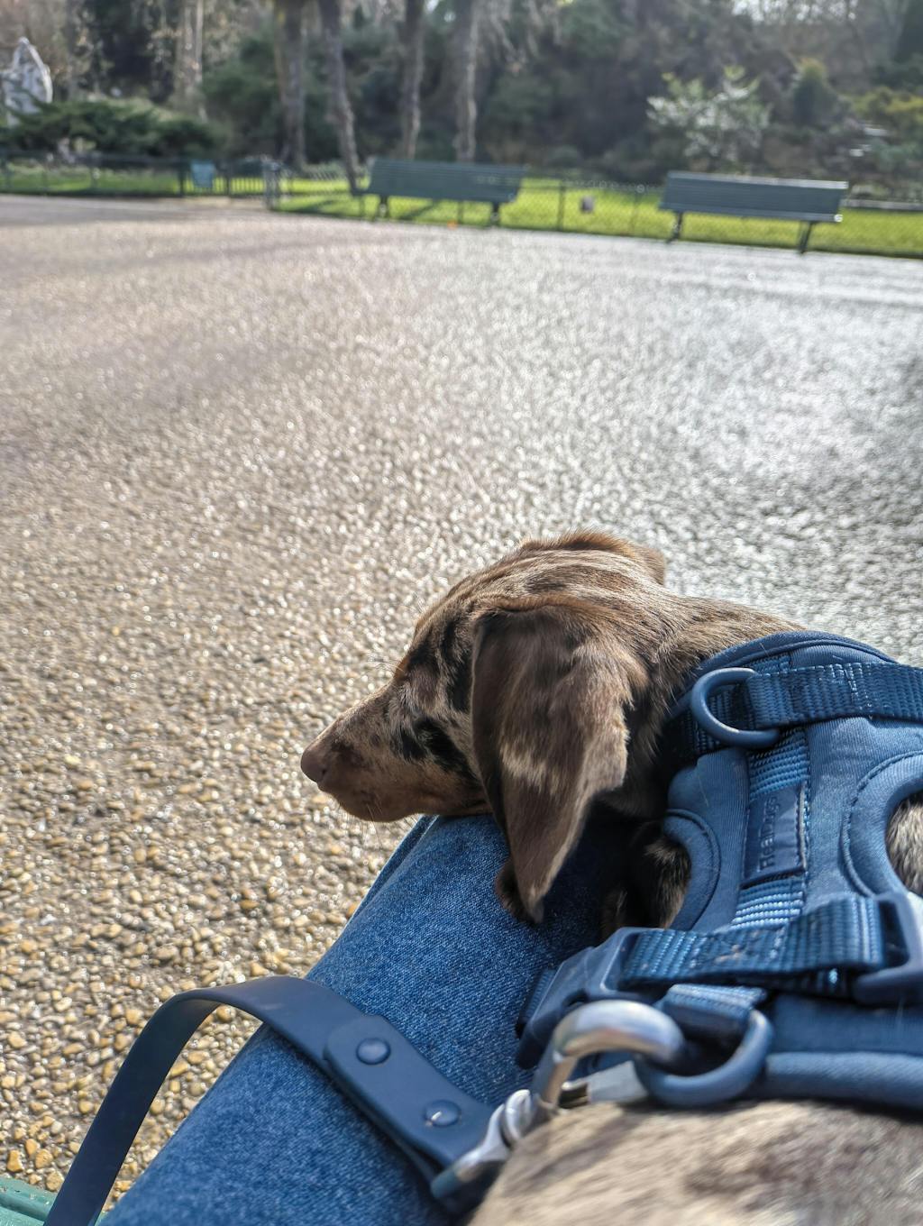- Arnés: Base de poliéster elástico suave, correas de nylon tejido, anillas en D de acero al carbono revestido.